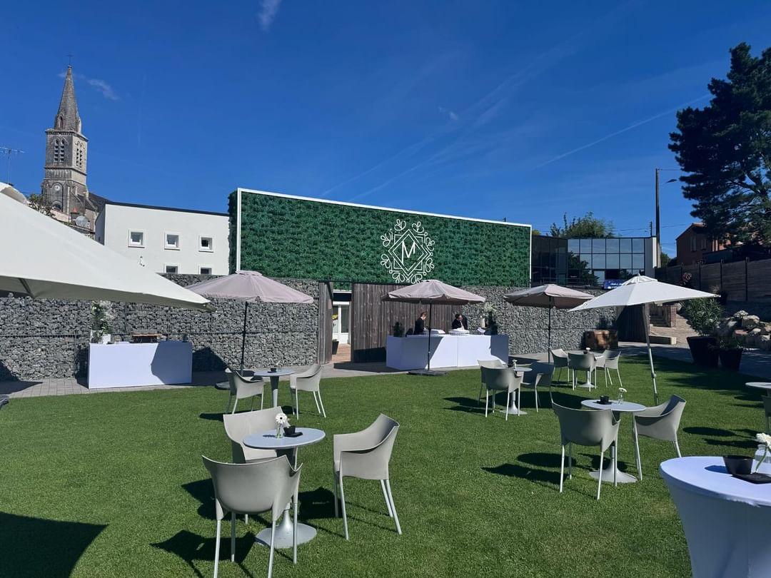 Plus de 3000 m² de Jardin, mur gabion, palissade de bois, terrasse Lounge, éclairage Led… tous ces éléments ajoute une touche moderne dans l’ambiance de la réception